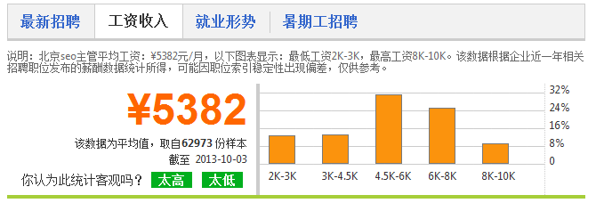 用户搜索的模式也就是用户会怎么查找一个信息,信息展示的模式是指一条信息需求用什么展示出来。具体的我们可以举例说明下:比如我们搜索“北京seo主管待遇”信息用户该怎么展示是满足用户需求的呢,很明显的比如百度的前3个都是一些综合数据处理后的展示图表,因为人们搜索这个词的目的就是想知道一个大体的综合水平,所以我们说通过这类的展示方式算是满足了需求了,而4、5、6位很明显的都是一个企业的待遇展示,信息展示模式和用户搜索不匹配。