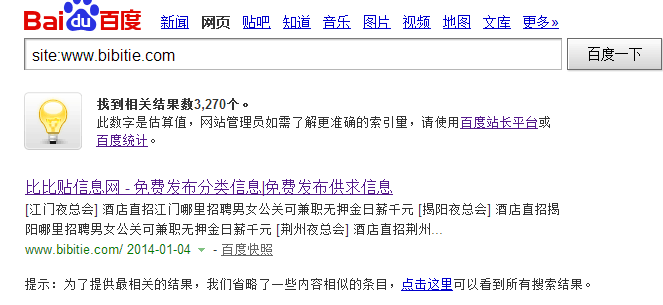 比比贴曾经的一度都是人们喜欢的信息推广平台,而且权重也不错,很多长尾词会有一定的排名,每天都有大量的信息被发布在上面,但是最近人们发现了一个问题,那就是比比贴信息网被百度K掉了,收录只剩下1个首页了。虽然搜索品牌词还在首页,但是内页的收录却是没有了。